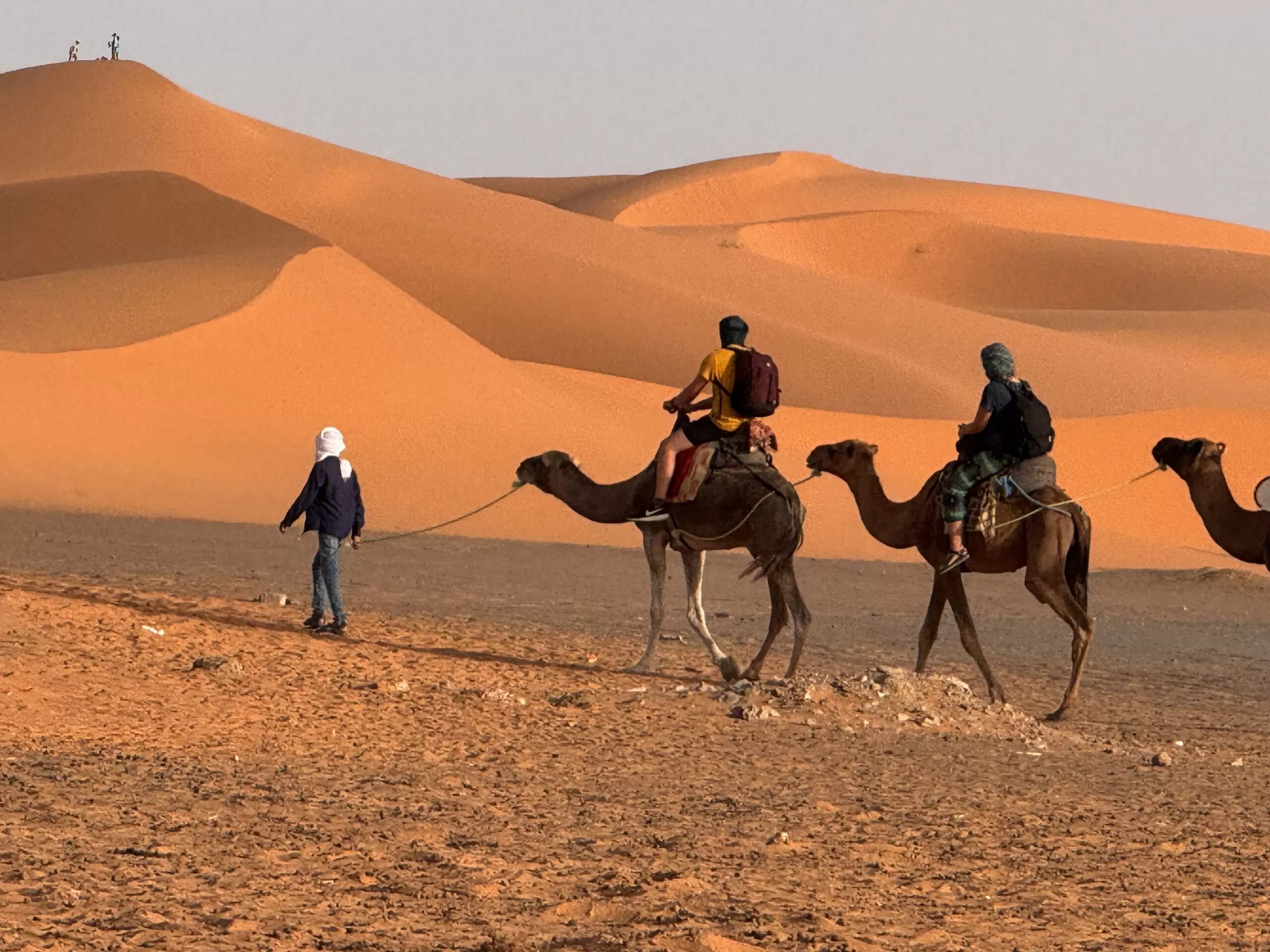 El viaje continúa hasta el desierto del Sáhara, donde vivirás una experiencia única: un paseo en camello al atardecer y una noche mágica bajo las estrellas en un campamento bereber.